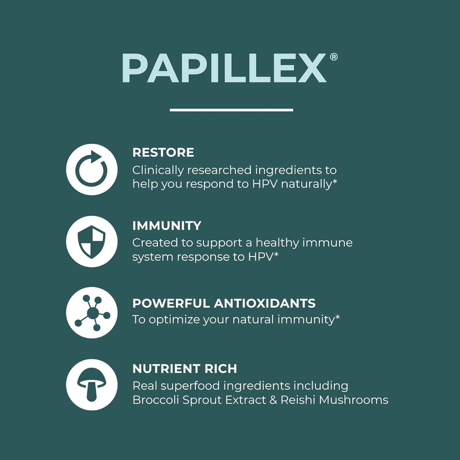 - USO PARA: Papillex es un suplemento rico en nutrientes, clínicamente investigado, diseñado para respaldar su respuesta inmune al VPH.