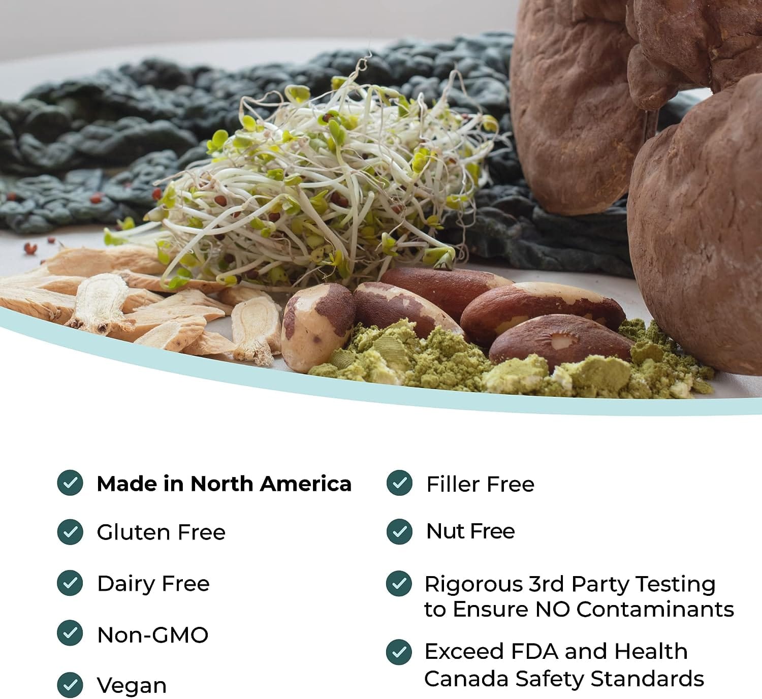 Vitaminas A, B12, C y E, zinc, ácido fólico, selenio, extracto de hoja de té verde, extracto de brotes de brócoli, extracto de raíz de astrágalo, extracto de licopeno natural, extracto de hongo reishi, hipromelosa (cápsula), harina de arroz y estearato de magnesio.